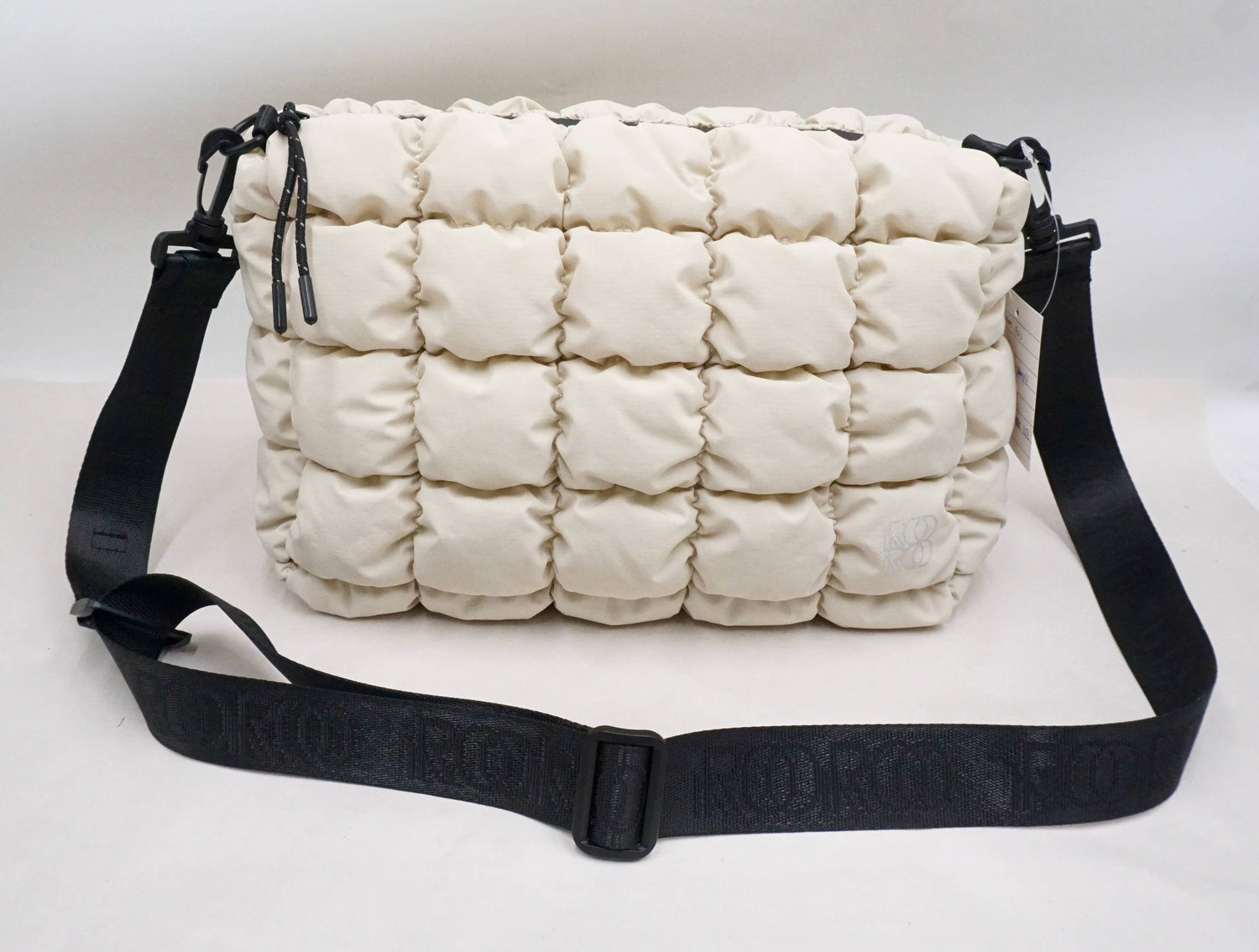 Lightweight, water-resistant ripstop, puffy, quilted shoulder bag with adjustable logo strap to lengthen to wear as a crossbody. Fully lined, with zippered pocket at interior. Multi-looped webbing at shoulder strap to allow for attachments such as accessories, small pouches, and carabiners.