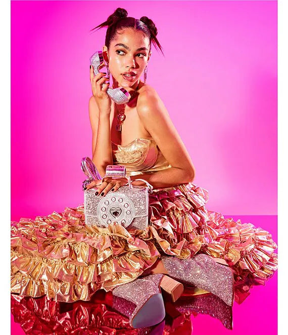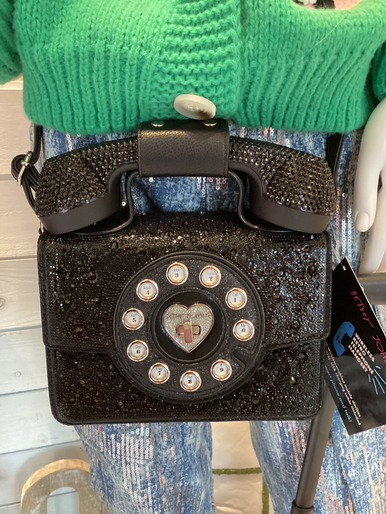 From Betsey Johnson, the Rhinestone Party Line Phone Crossbody Bag features:
