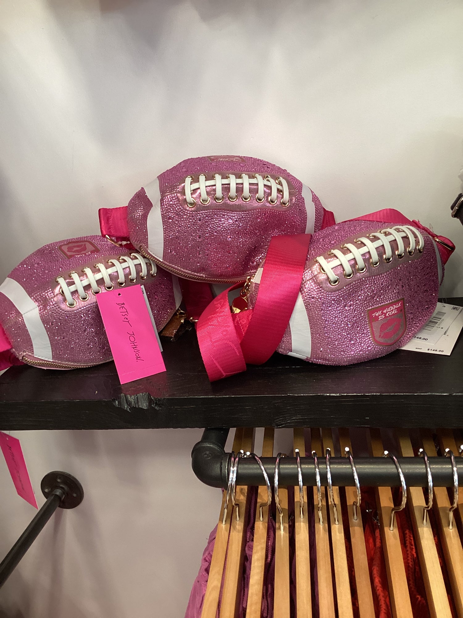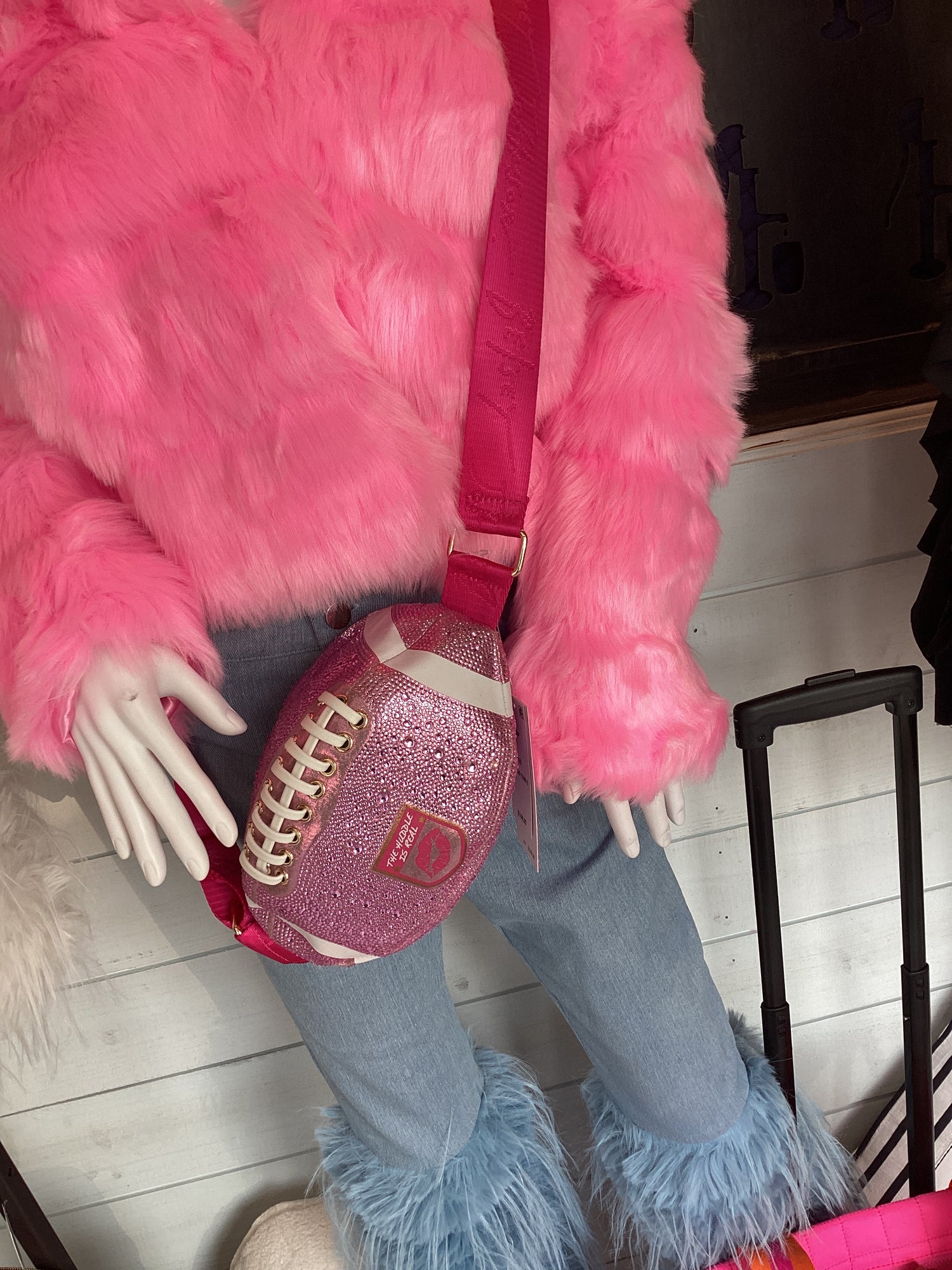 Get ready to tackle your fashion game with Kitsch's "Tackle Me" sling bag! This pink rhinestone football-shaped bag will add some sparkle and fun to any outfit. Perfect for game day or a night out with friends. Don't miss out on this unique accessory!