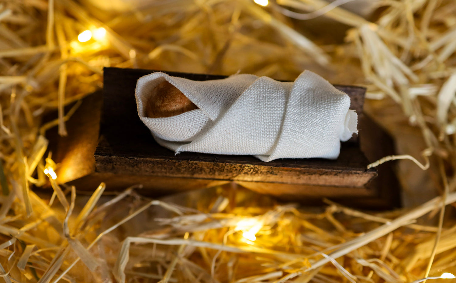 Jesus is 3" long and lying in a 5" custom handmade in the USA stained poplar cradle with a 7 1/2" wide base and swaddled in 100% white linen fabric.