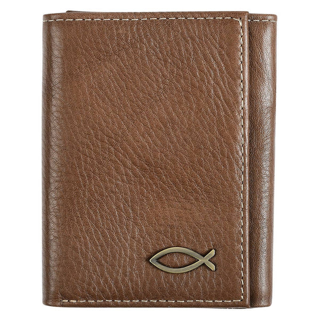 Smooth genuine leather is used in the construction of the brown trifold wallet, and its edges are topstitched to ensure durability. A small brass ichthus fish is the only decoration and is attached to the bottom right corner of the wallet.