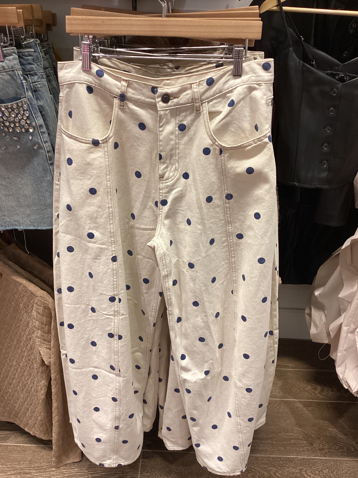 IP200313-01 Polka Dot Wide Denim Pants - Small is backordered and will ship as soon as it is back in stock.
