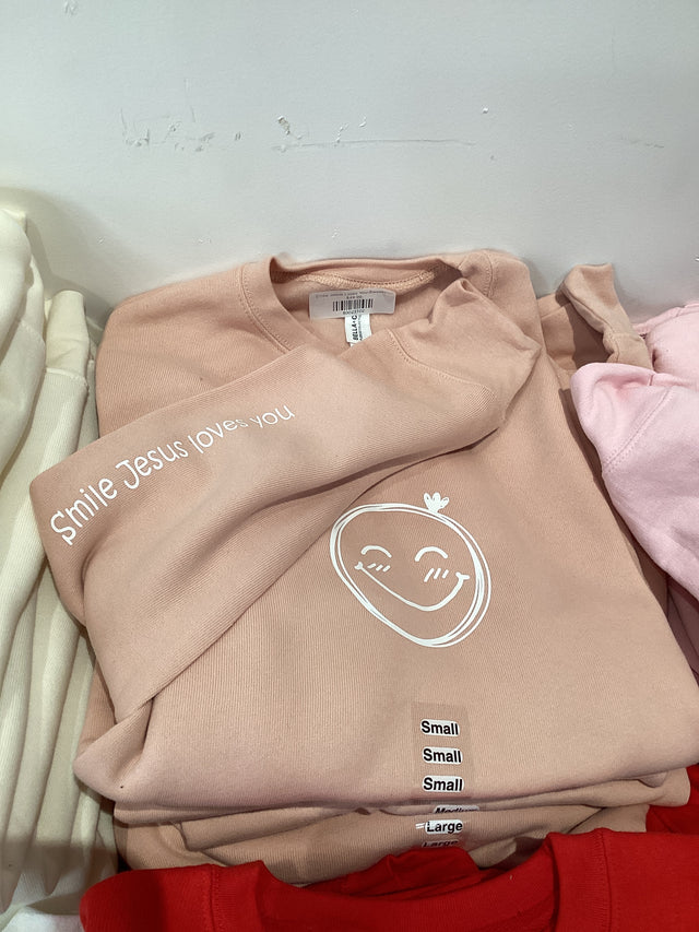 44SRSU SAVIOR "Smile Jesus Loves You" Sweatshirt - Peach / XLarge is backordered and will ship as soon as it is back in stock.
