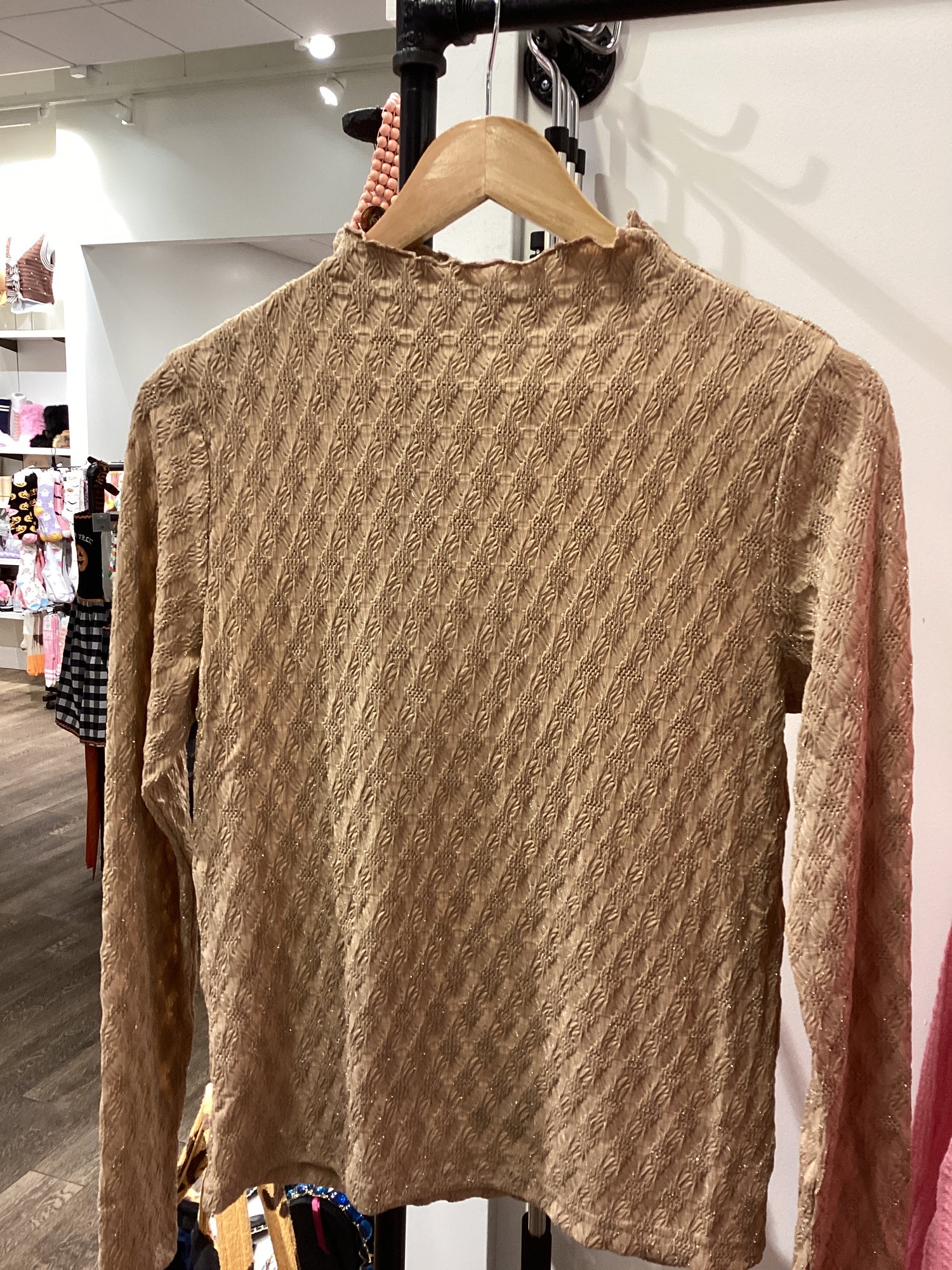 SY9311 Taupe Mock Neck Shine - Small is backordered and will ship as soon as it is back in stock.