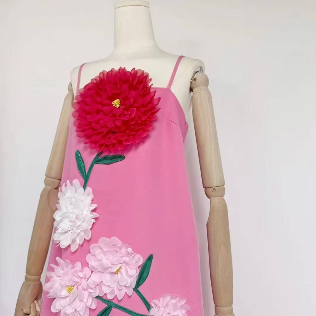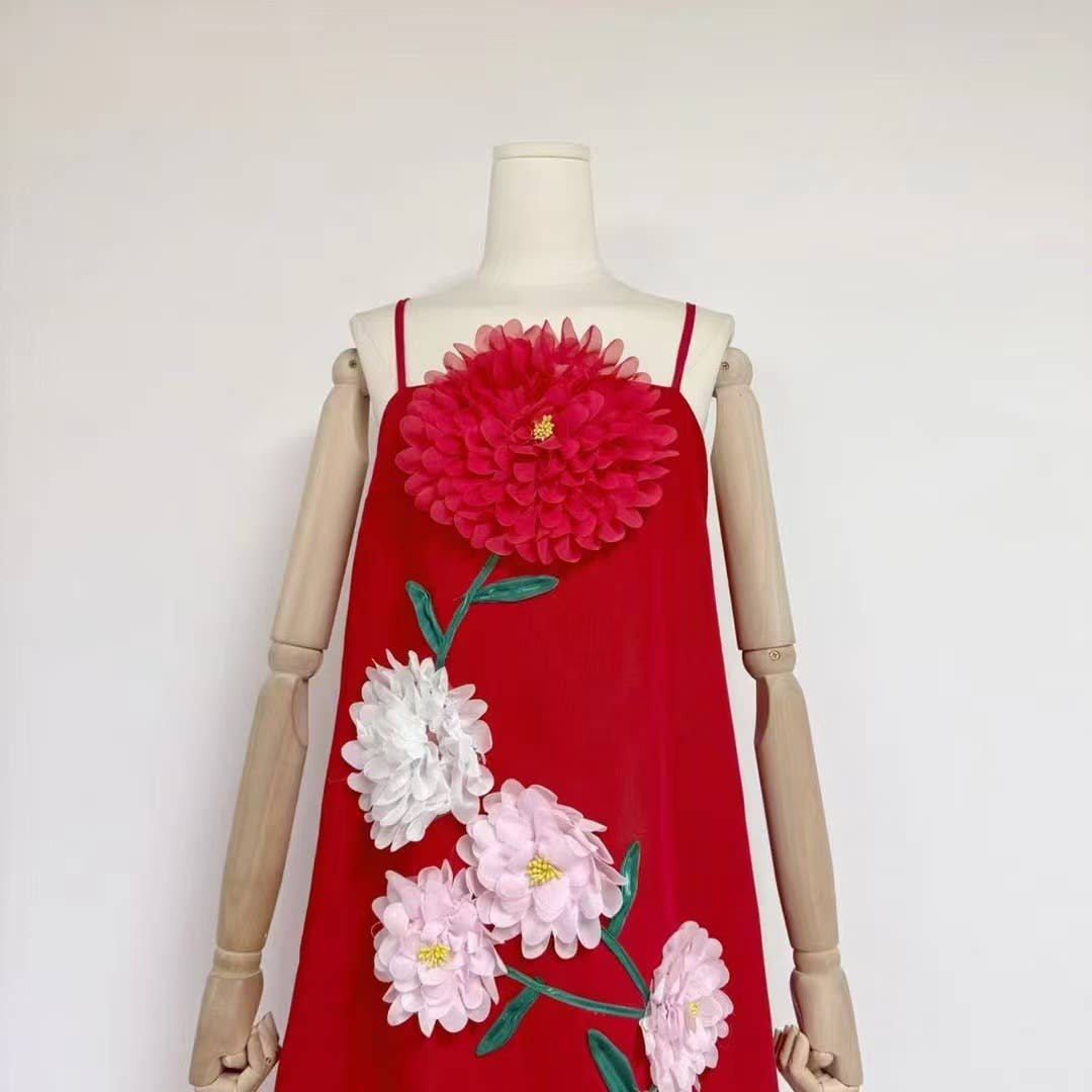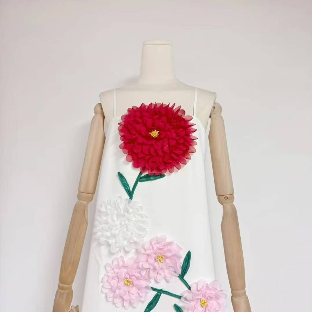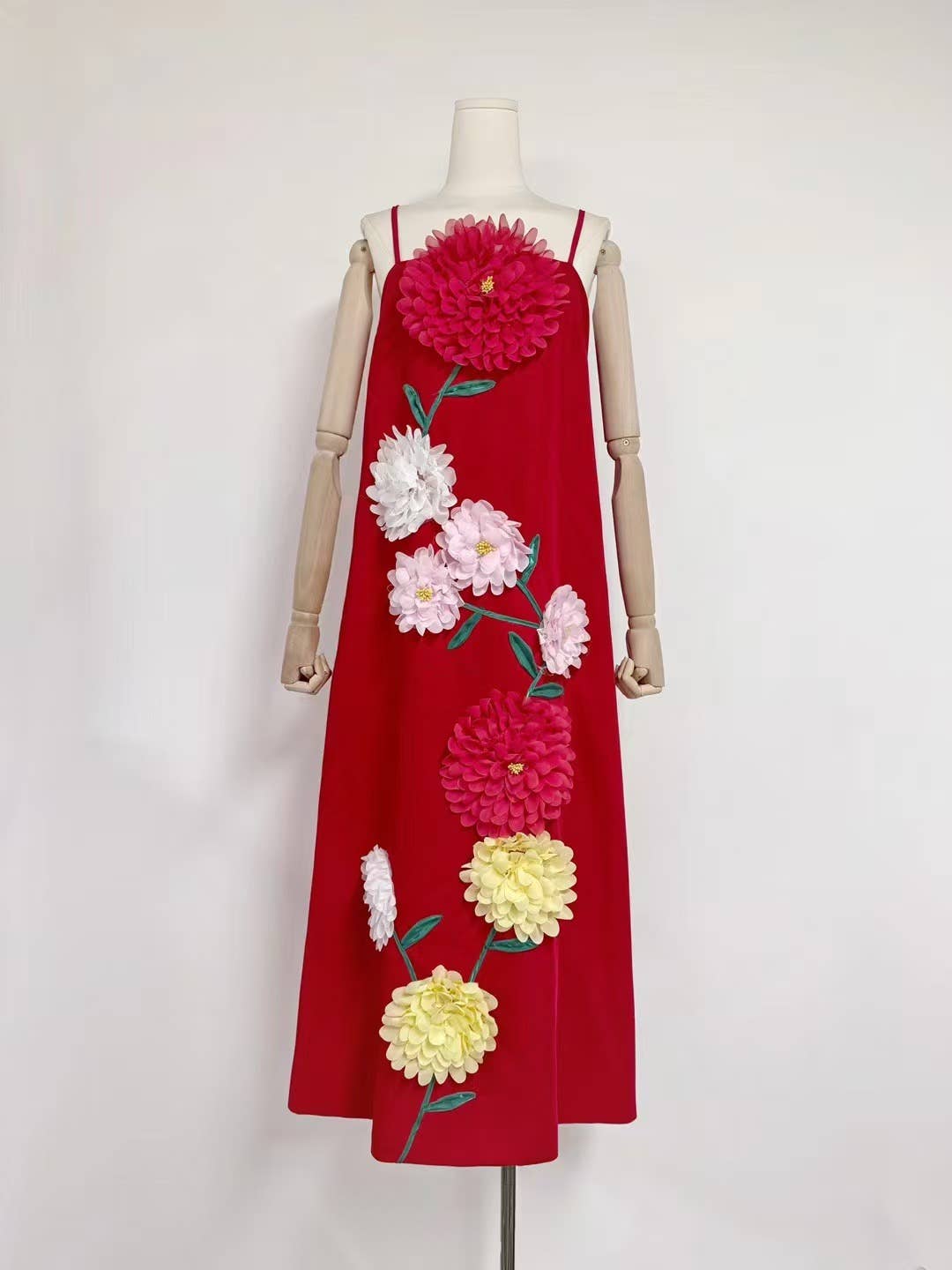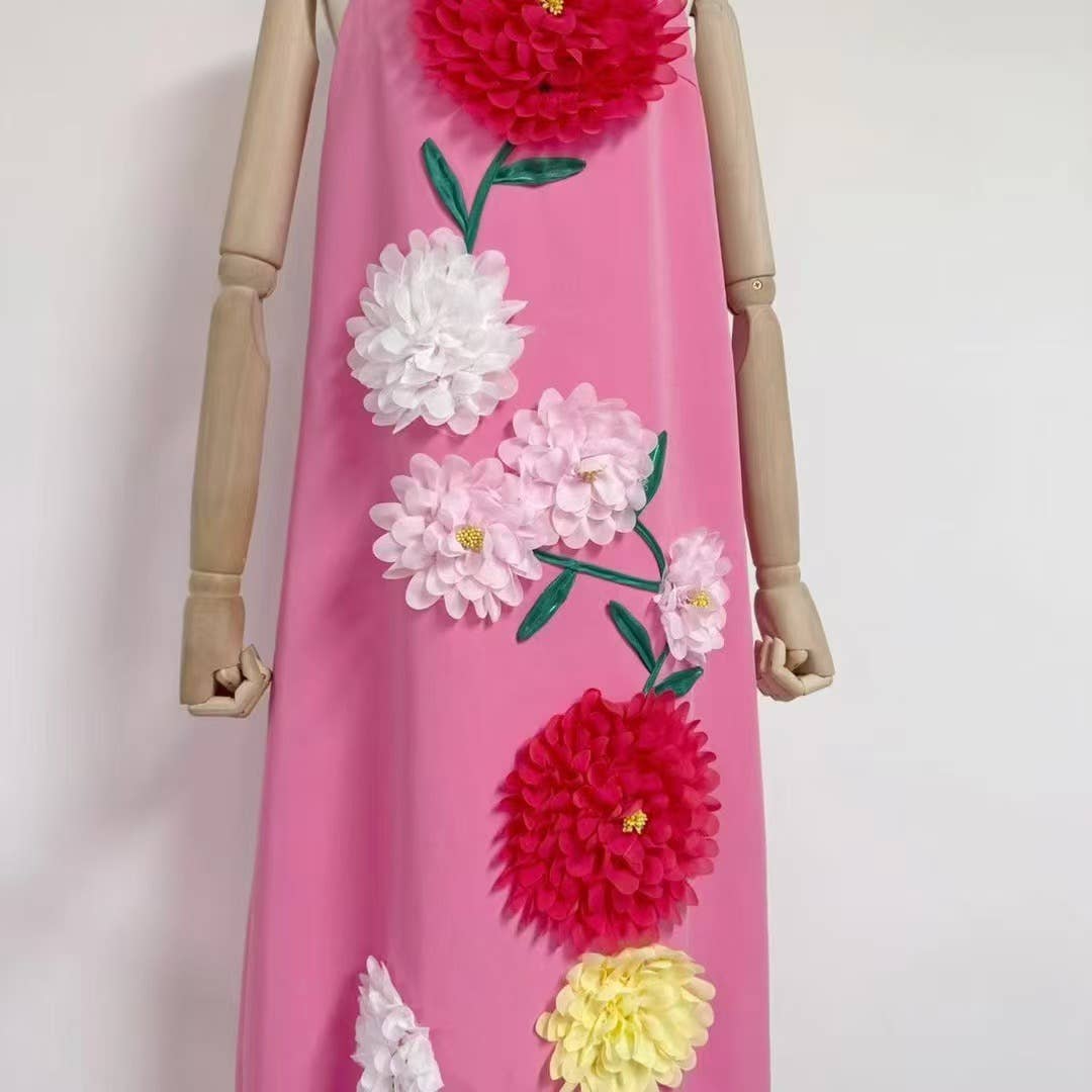 This vibrant summer dress features a large swing design adorned with stunning three-dimensional floral decorations in a variety of colors, creating a lively and eye-catching look. The suspender-style straps add a playful touch, while the flowing long skirt ensures elegance and comfort. Perfect for garden parties, beach outings, or festive events, this dress combines charm and practicality. The tile and photo highlight the intricate craftsmanship and vivid details, making it a standout piece for your summer wardrobe.