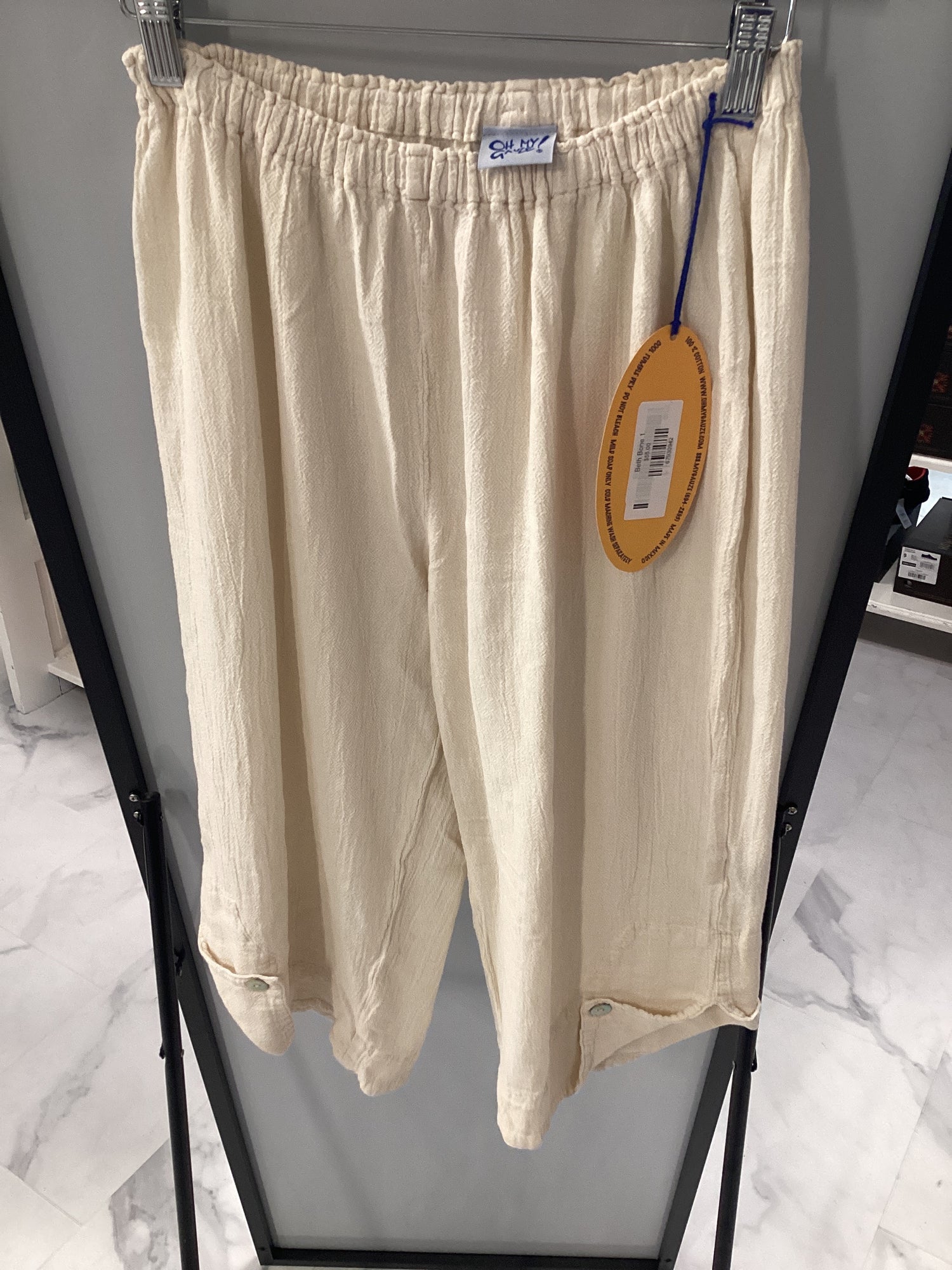 A popular, short capri cotton gauze pant with a short side slit hemline, and cute buttons for an extra accent.