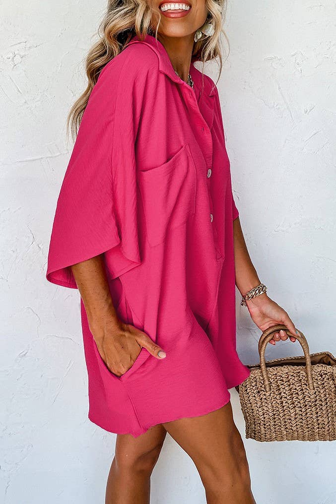 Button down overfit romper - fuchsia / L is backordered and will ship as soon as it is back in stock.