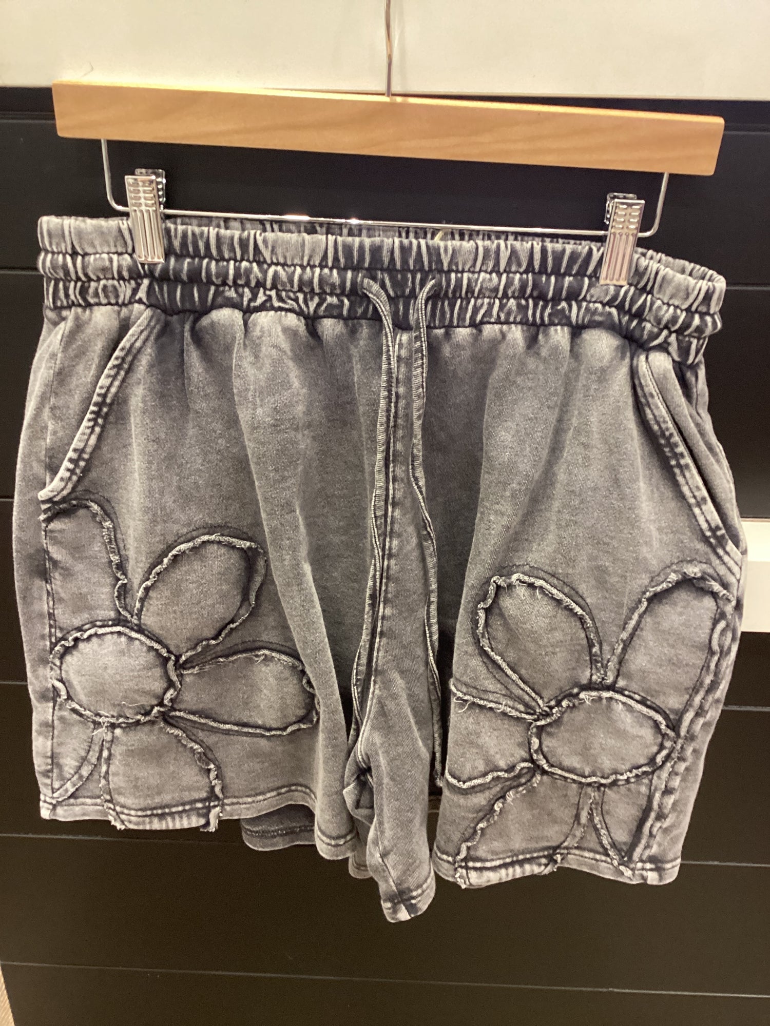 EB90110 FLOWER PATCH MINERAL WASHED SHORTS - Small is backordered and will ship as soon as it is back in stock.
