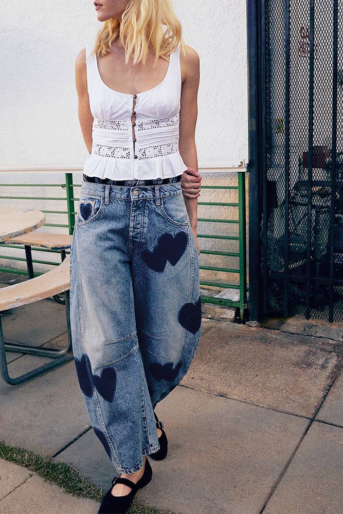 Charming Design: Embrace unique style with heart-patterned jeans that stand out effortlessly.