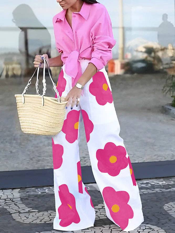 Loose Wide Leg Contrast Color Floral Printed Casual Pants Bo - S / PINK is backordered and will ship as soon as it is back in stock.