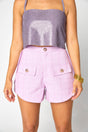Add a sophisticated touch to your wardrobe with the Mae High-Waisted Shorts! The Mae Shorts feature tweed fabric with gold button accents, faux front pockets, and a zipper and button closure.