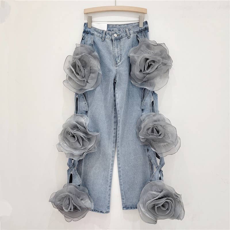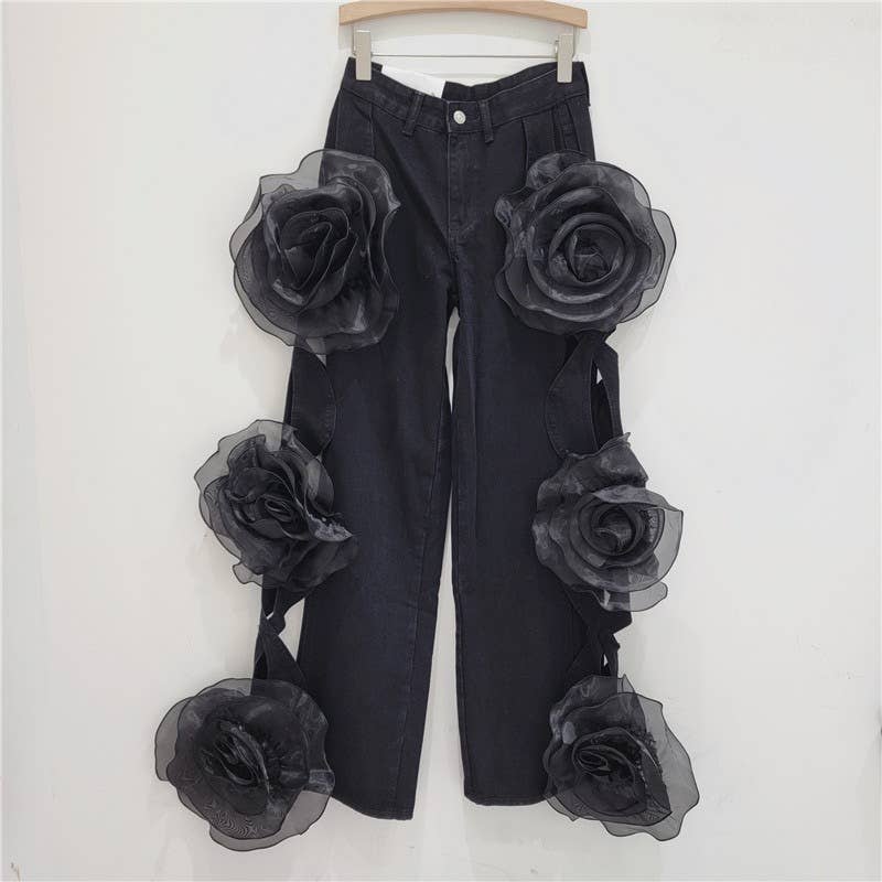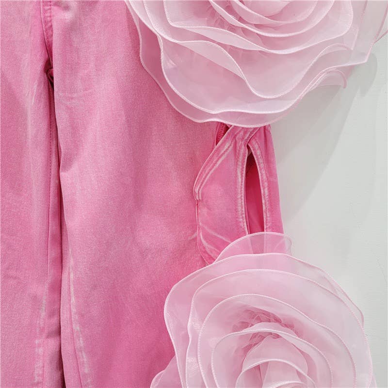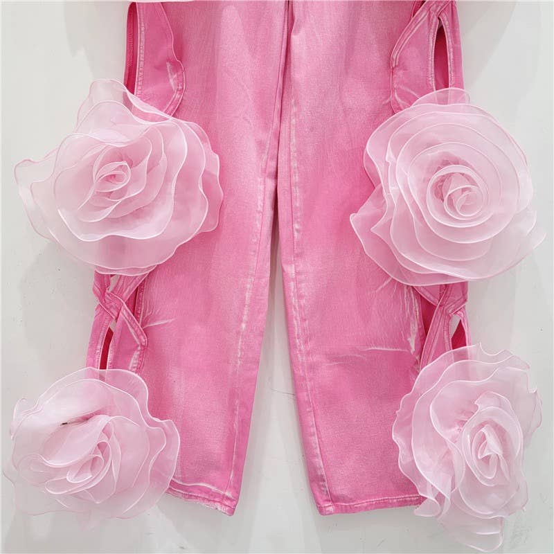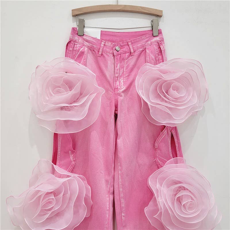 Unveil these stunning Pink Rose Denim Palazzo Pants, perfect for making a bold fashion statement. Crafted with care, these high-waisted trousers boast an eye-catching hollow flower design with oversized fabric roses adorning the full length of the wide-leg silhouette. The vibrant pink hue adds a pop of color to any outfit, while the floor-length cut ensures an elegant drape that flatters all body types. Ideal for boutiques looking to offer their clients something extraordinary, these trousers are not just clothing but a conversation starter.