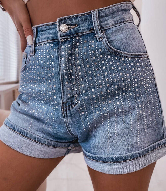 Rhinestone embellishments add a touch of sparkle and glamour to these denim shorts