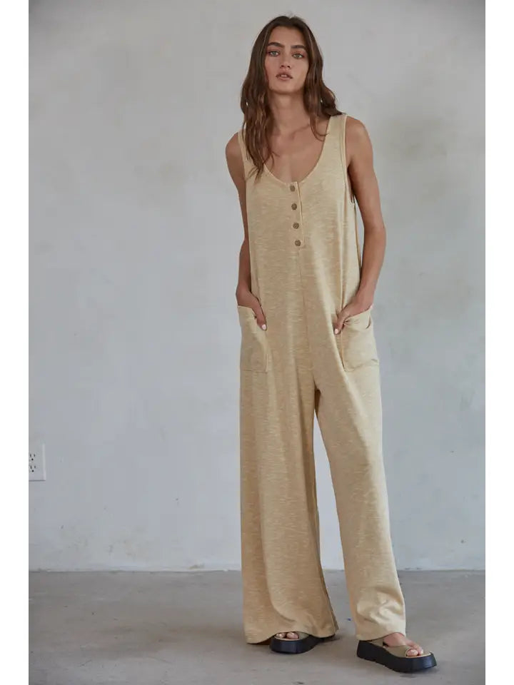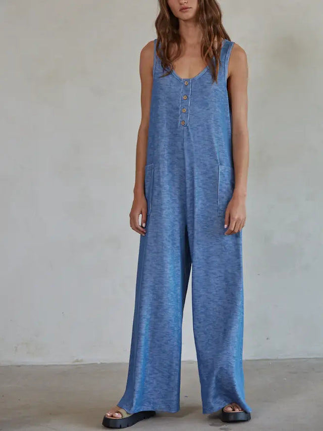 EADIE JUMPSUIT Knit Linen Cotton Rayon Ribbed Half Buttondown Scoop Neck Sleeveless Wide Leg Jumpsuit With Side Pockets (No Lining).