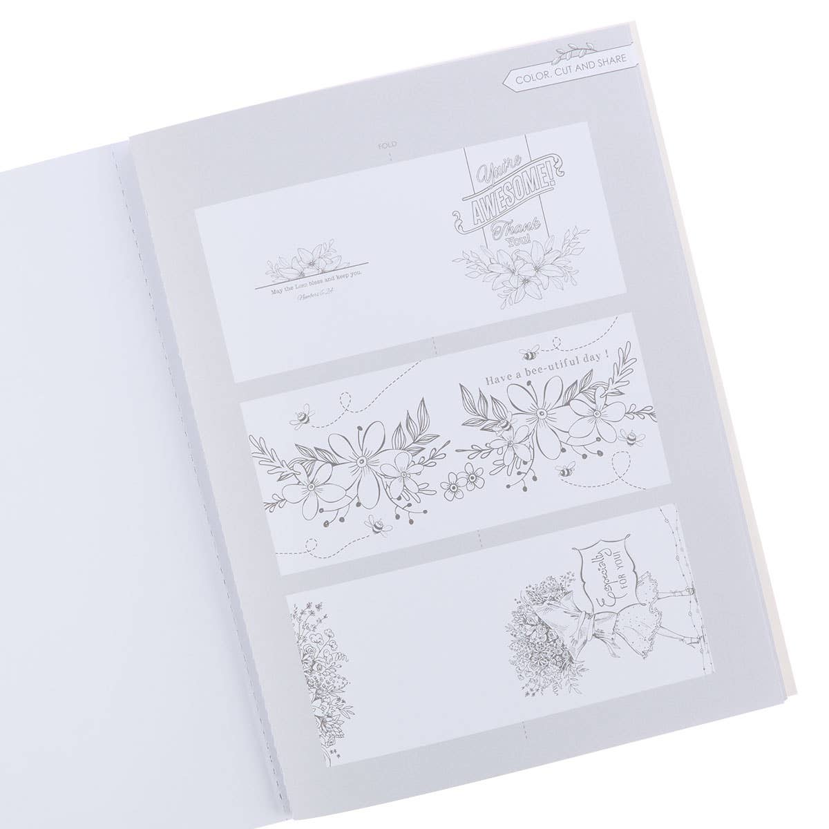 Meditate on the words of Jesus in a colorful and creative way while you color your way through the Color the Words of Jesus Coloring Book. This inspirational coloring book for adults features Scripture art that help you find peace and hope as you store God's Word in your heart through coloring and meditation. The cover of the Color the Words of Jesus Coloring Book is white and features a beautiful display of succulents in shades of green accented by gold foil. The title is displayed in green and also accented with gold foil. Coloring Book