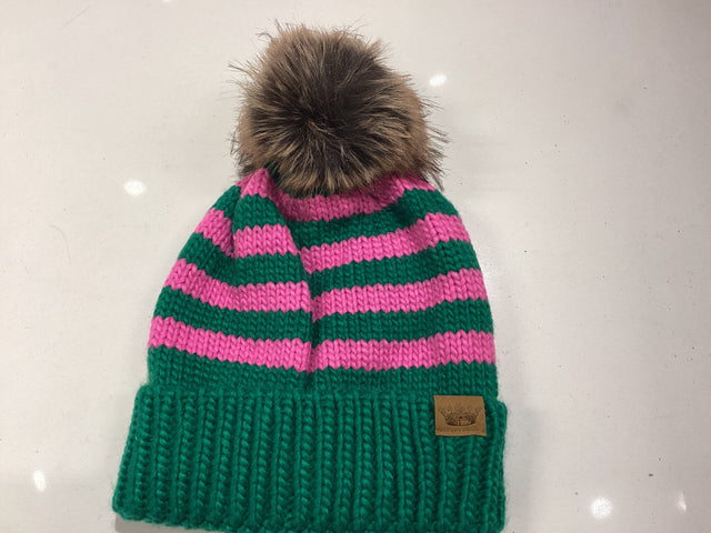 H-918 Green & Pink Striped Pom Hat