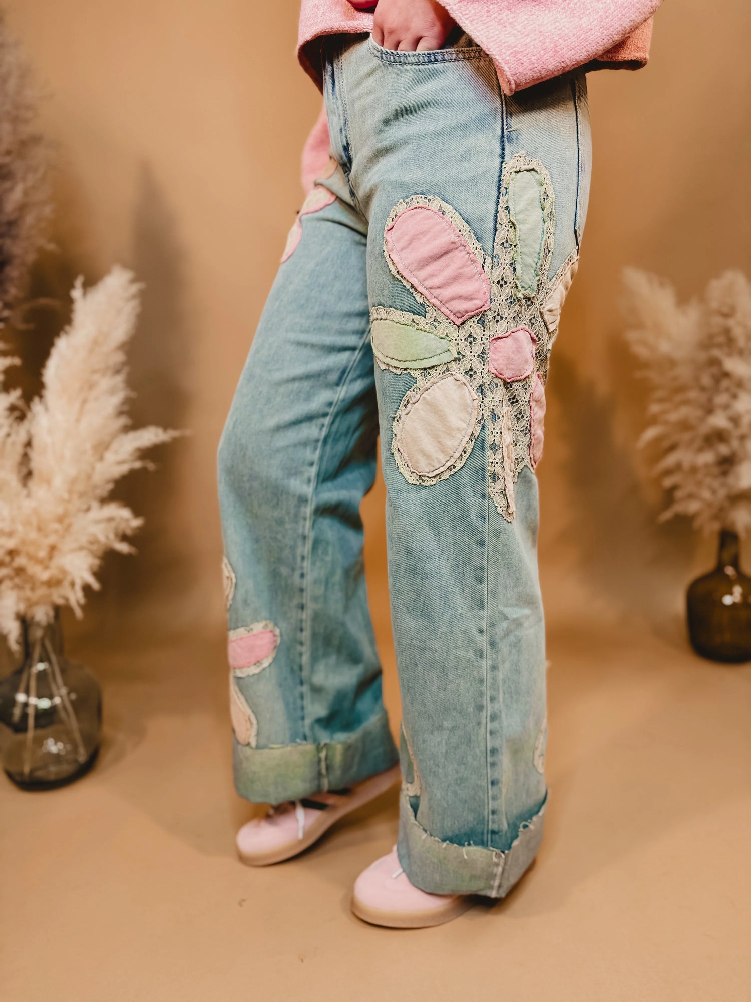 JP0609 WASHED FLOWER PATCH DENIM - Large is backordered and will ship as soon as it is back in stock.
